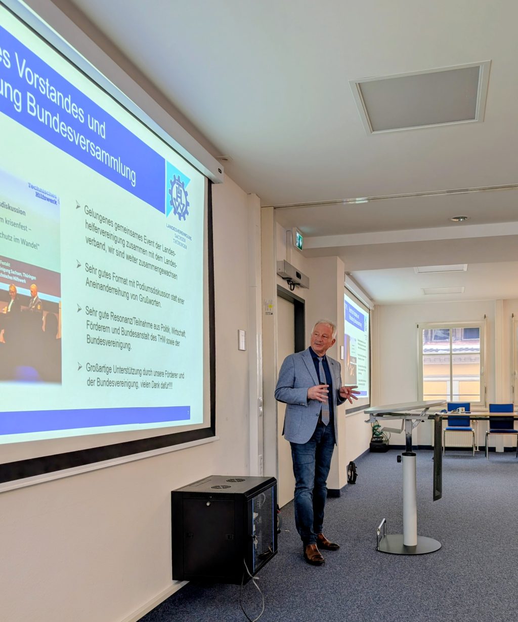 Der Vorstandsvorsitzende der Landesvereinigung Udo Stöckel berichtete über das zurückliegende ereignisreiche Jahr 2025. Dabei legte er den Schwerpunkt auf den Festakt und die Blaue Party, die anlässlich des 30. Geburtstags der Landesvereinigung und des 75. THW-Geburtstages ausgerichtet worden waren. Er bedankte sich insbesondere bei allen Unterstützern des Festaktes wie den Förderern, der Bundesvereinigung des THW und dem Organisationsteam. Außerdem sprach die Stellvertretende